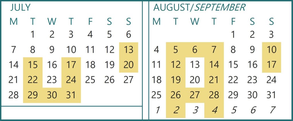 Actors must also be available for all of Tech Sunday, September 7; for the Tech Week evenings of Monday through Thursday, September 8 to 11; and for all performances: