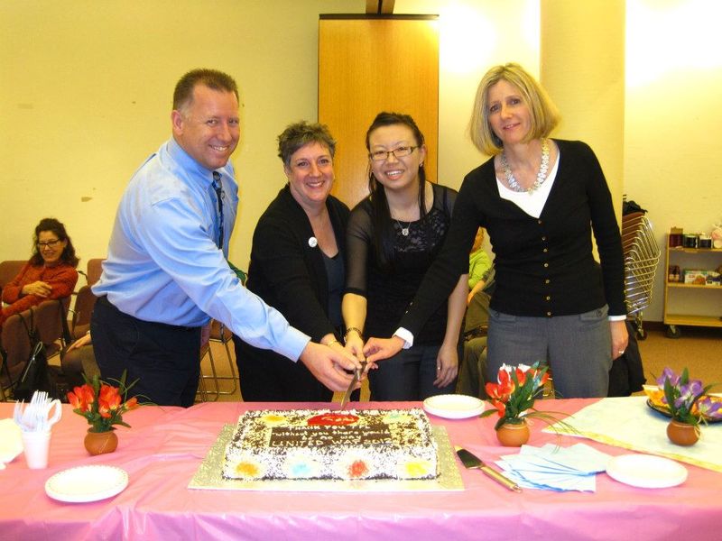 Cake cutting at TPL Thank-You Tea on January 28, 2013. Left to Right: Wayne Aitchison, Maureen O'Reilly (President, TPLWU Local 4948), Debby Ng, and Jane Pyper (City Librarian)