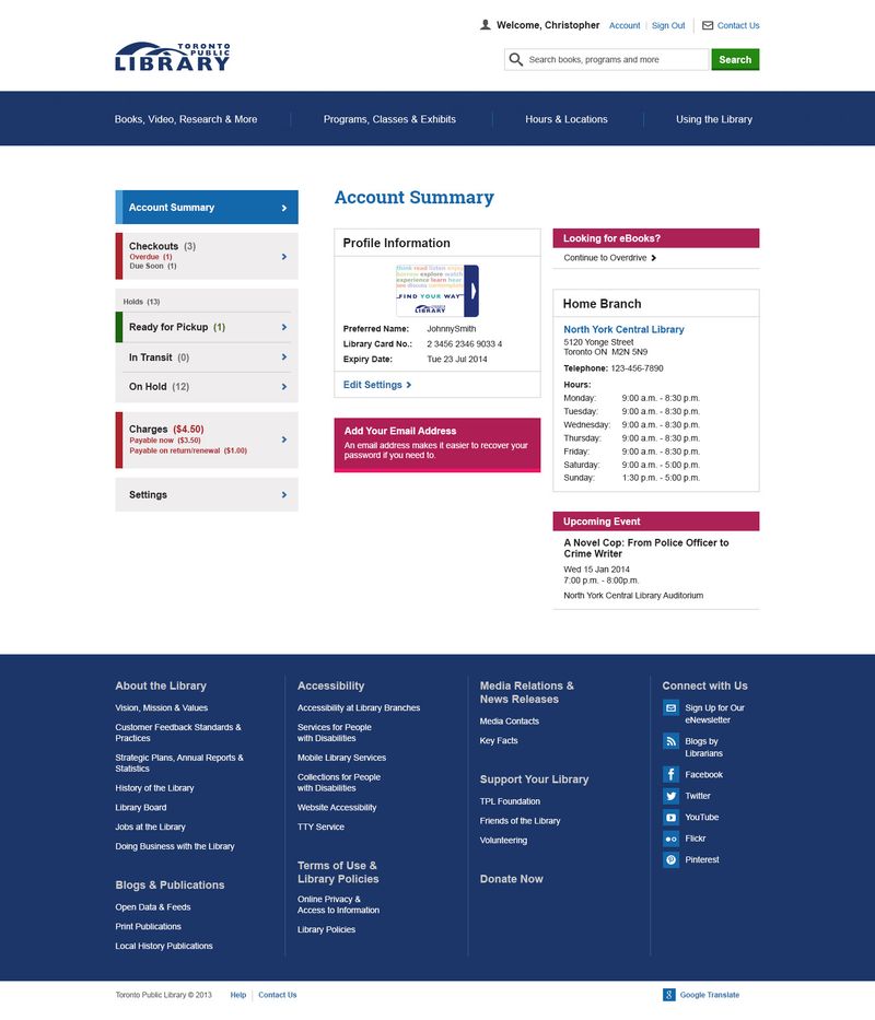 I think I’d rather see a summary of books out (with due date) + my pick-ups available as the “home” instead of my account # and expiry date in the main container. Reduce the number of click-throughs via the side nav. But that’s a personal preference. Happy to work with the layout as it’s presented.