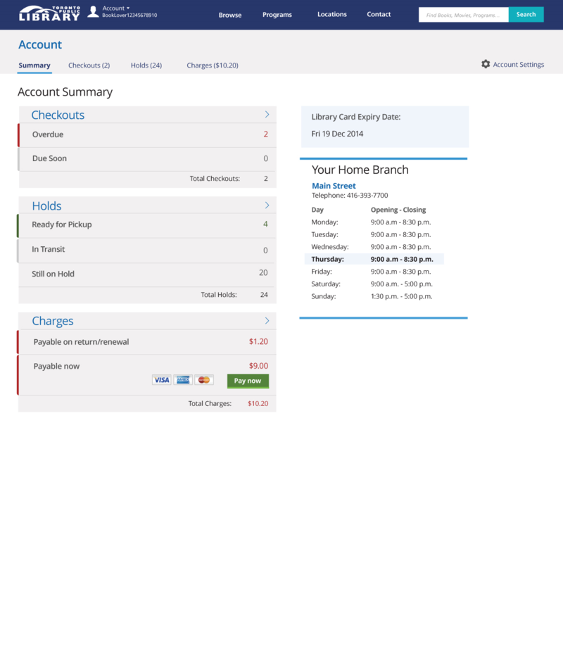 My library card expiry date is probably the least useful information on this page. I don’t think it needs to be so prominent, or even needs to be on the summary page at all. I do like seeing my home branch hours.