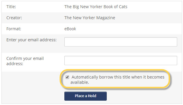 Note that the box is checked by default. If you leave it selected, OverDrive will automatically check the book out to your account as soon as it becomes available.